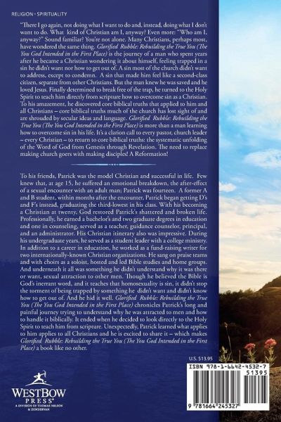 "There I go again, not doing what I want to do and, instead, doing what I don't want to do. What kind of Christian am I, anyway? Even more: "Who am I, anyway?" Sound familiar? You're not alone. Many Christians, perhaps most, have wondered the same thing. Glorified Rubble: Rebuilding the True You (The You God Intended in the First Place) is the journey of a man who spent years after he became a Christian wondering it about himself, feeling trapped in a sin he didn't want nor how to get out of. A sin most of the church didn't want to address, except to condemn. A sin that made him feel like a second-class citizen, separate from other Christians. But the man knew he was saved and he loved Jesus. Finally determined to break free of the trap, he turned to the Holy Spirit to teach him directly from scripture how to overcome sin as a Christian. To his amazement, he discovered core biblical truths that applied to him and all Christians - core biblical truths much of the church has lost sight of and are shrouded by secular ideas and language. Glorified Rubble: Rebuilding the True You (The You God Intended in the First Place) is more than a man learning how to overcome sin in his life. It's a clarion call to every pastor, church leader - every Christian - to return to core biblical truths: the systematic unfolding of the Word of God from Genesis through Revelation. The need to replace making church goers with making disciples! A Reformation!
