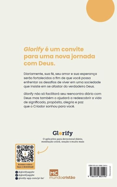 Glorify, o aplicativo #1 de devocional cristão e bem-estar, apresenta agora uma nova ferramenta em formato de livro! Glorify é um convite para uma nova jornada com Deus. Diariamente, sua fé, seu amor e sua esperança serão fortalecidos a fim de que você possa enfrentar os desafios de viver em uma sociedade que insiste em se afastar do verdadeiro Deus. Glorify não só facilitará seu reencontro diário com Deus mas também o ajudará a redescobrir a vida de significado, propósito, alegria e paz que o Criador sonhou para você. *** O objetivo do Glorify é tornar-se seu auxiliar diário em sua jornada espiritual, possibilitando que você tenha um encontro com Deus que transforme sua vida por completo. Nossa esperança é que você - e, em última instância, todo cristão, todos os dias - encontre alegria e intimidade com Deus por intermédio do Glorify. Acreditamos que conexões pequenas e constantes com Deus podem ajudar a combater a ansiedade, viver com propósito, dormir melhor e apoiar seu bem-estar geral. Queremos capacitar você a refletir e a desfrutar seu tempo diário com Deus da maneira que melhor se encaixe em sua rotina. Este livro, portanto, é sua oportunidade de reimaginar e aprofundar sua conexão com Deus.