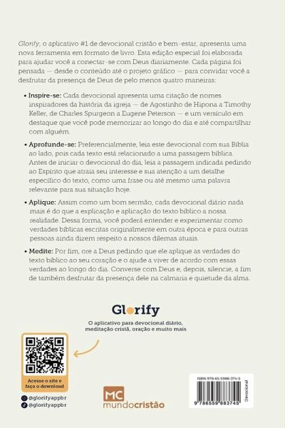 Glorify, o aplicativo #1 de devocional cristão e bem-estar, apresenta uma nova ferramenta em formato de livro. Esta edição especial foi elaborada para ajudar você a conectar-se com Deus diariamente. Cada página foi pensada - desde o conteúdo até o projeto gráfico - para convidar você a desfrutar da presença de Deus de pelo menos quatro maneiras: Inspire-se: Cada devocional apresenta uma citação de nomes inspiradores da história da igreja - de Agostinho de Hipona a Timothy Keller, de Charles Spurgeon a Eugene Peterson - e um versículo em destaque que você pode memorizar ao longo do dia e até compartilhar com alguém. Aprofunde-se: Preferencialmente, leia este devocional com sua Bíblia ao lado, pois cada texto está relacionado a uma passagem bíblica. Antes de iniciar o devocional do dia, leia a passagem bíblica indicada pedindo ao Espírito que atraia seu interesse e sua atenção a um detalhe específico do texto, como uma frase ou até mesmo uma palavra relevante para sua situação hoje. Aplique: Assim como um bom sermão, cada devocional diário nada mais é do que a explicação e aplicação do texto bíblico a nossa realidade. Dessa forma, você poderá entender e experimentar como verdades bíblicas escritas originalmente em outra época e para outras pessoas ainda dizem respeito a nossos dilemas atuais. Medite: Por fim, ore a Deus pedindo que ele aplique as verdades do texto bíblico ao seu coração e o ajude a viver de acordo com essas verdades ao longo do dia. Converse com Deus e, depois, silencie, a fim de também desfrutar da presença dele na calmaria e quietude da alma.