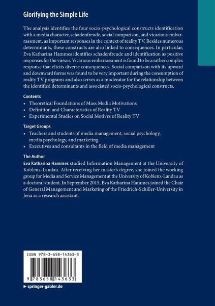 The analysis identifies the four socio-psychological constructs identification with a media character, schadenfreude, social comparison, and vicarious embarrassment, as important responses in the context of reality TV. Besides numerous determinants, these constructs are also linked to consequences. In particular, Eva Katharina Hammes identifies schadenfreude and identification as positive responses for the viewer. Vicarious embarrassment is found to be a rather complex response that elicits diverse consequences. Social comparison with its upward and downward forms was found to be very important during the consumption of reality TV programs and also serves as a moderator for the relationship between the identified determinants and associated socio-psychological constructs.