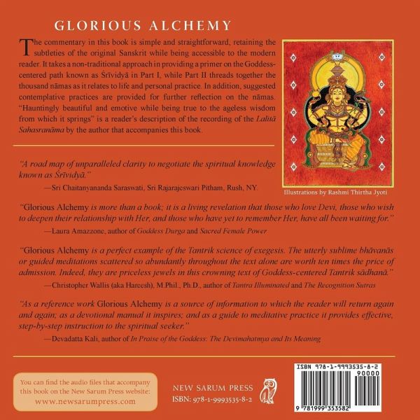 Chanting or listening to the one thousand names of the Lalita Sahasranama is a treasured practice among lovers of the red-hued Lalita Mahatripurasundari. If we can view this chant through the lens of the philosophy on which it is expounded, the namas pour into the moment-to-moment unfolding of life, which becomes infused with Lalita Devi's radiant presence. Instead of being hindrances to liberation, our challenging life circumstances become the doorways to freedom. Each of the thousand namas is a mantra. When we invite the namas into our inner landscape, the Lalita Sahasranama becomes a garland of mantras, where every life experience is rendered sacred because it can be found in the velvety folds of the chant. This kind of practice opens us to uncommon wisdom and sweetness-this is Glorious Alchemy! This commentary takes a non-traditional approach and provides a primer on Srividya, exploring concepts such as Ku¿¿alini, pra¿a, kosas, karma and acaras. Part II threads together the thousand namas on the basis of Srividya philosophy as it relates to life and personal practice. In addition, suggested contemplative practices are provided for further reflection on the namas. This book comes with a recording of the Lalita Sahasranama, as well as a guided meditation to facilitate the contemplative practices in Part II. Lnks to the recording are available on the New Sarum Press website.