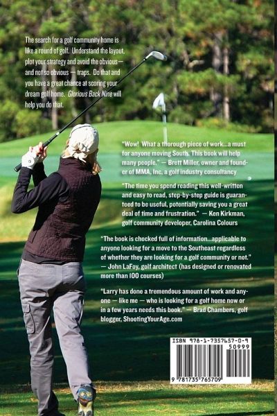 Over the last decade and a half, Larry Gavrich has worked with hundreds of couples and individuals searching for their dream homes in golf-centric areas. Most of them opted to buy a home or property inside the gates of a golf community, guaranteeing themselves not only access to a golf course (or two) within walking or golf-cart distance from their houses, but also putting them close to a wide range of other amenities, such as fitness centers, walking trails and swimming pools. A few chose to live in more traditional neighborhoods but a short drive to excellent golf. If you are retired, or near retirement, and have dreamed about a move to a warm climate with plenty of outdoor activities, including golf, what are you waiting for? Glorious Back Nine: How to Find Your Dream Golf Home details a step-by-step approach that starts with a kitchen-table discussion about retirement goals and ends at the front door of your dream home on the course. In between you will learn about how climate and geography affect your ultimate choice; lifestyle options; how to select a qualified real estate buyer's agent; the various types of country club memberships; cost-of-living variables; homeowner association costs; how to plan your inspection visits and the right questions to ask during those visits; and much more. Glorious Back Nine is the only guide of its kind published in the last decade. It will answer many of your questions and, just as important, will arm you with the right ones to ask. The purchase of any home is a huge investment, possibly the biggest of your life, and you want to make sure you have all the information you need before taking the leap. Your retirement is the payoff for a successful career and family life. You should be armed with all the information you need to find your Glorious Back Nine. You will be if you read this book.