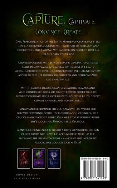 Gaia. Personification of the Earth. Mother of giants, monsters, titans. A primordial goddess with a history of rebellion and destruction, and a woman with a stubborn desire to have all her children at her side. A revered goddess with powers beyond imagination, she has allies in low places, and access to the most off-limits areas-including the perilous Underworld jail. Gaia needs that access to free her imprisoned children and dethrone Zeus, once and for all. With the aid of dead soulmates, zombified humans, and mind-controlled gods, she aims to restore order to Earth before it consumes itself, overrun with political feuds, deadly climate changes, and human greed. Angry and determined, she's on a warpath to avenge her beloved offspring locked up centuries ago. Holding on to a grudge many thought buried, Gaia will stop at nothing until she's successful. Untouchable. Glorious. Is anyone strong enough to stop a deity so powerful she can create armies with a well-placed whisper? Who has the wits-and the nerve-to oppose an ancient and incredibly resourceful goddess such as Gaia?