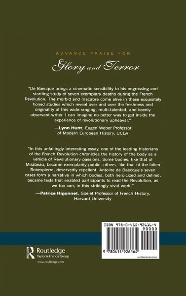 Glory and Terror is a vivid and often gory history of the darker side of the French Revolution. Through an examination of contemporary visual and literary representations of executions, funerals, processions and ceremonies it brings the often horrific events of the time to life. Honing in on seven real life cases, the author recounts and interprets: * the public autopsy performed on the corpse of Mirabeau * the exhumation and transportation of Voltaire's body to the Pantheon * the public torture, murder and subsequent mutilation of the Princesse de Lamballe * the agonizingly slow death of Robespierre. Anyone who enjoys dazzling cultural history in the vein of Robert Darnton, Carlo Ginzburg and Anthony Grafton will revel in this intelligent and original work.