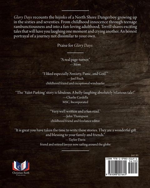 Glory Days recounts the hijinks of a North Shore Dangerboy growing up in the sixties and seventies. From childhood innocence through teenage rambunctiousness and into a fun-loving adulthood, Terrill shares exciting tales that will have you laughing one moment and crying another. An honest portrayal of a journey not dissimilar to your own.