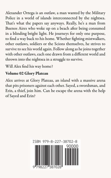 Alexander Ortega is an outlaw, a man wanted by the Military Police in a world of islands interconnected by the nightsea. That's what the papers say anyways. Really, he's a man from Buenos Aires who woke up on a beach after being consumed in a blinding bright light. He journeys for only one purpose, to find a way back to his home. Whether fighting mistwalkers, other outlaws, soldiers or the Scions themselves, he strives to survive to see his world again. Follow along as he joins together with other outlaws, each one drawn from a different world and thrown into the nightsea in a struggle to survive. Will Alex find his way home? Volume 02 Glory Plateau Alex arrives at Glory Plateau, an island with a massive arena that pits prisoners against each other. Sayed, a swordsman, and Erin, a thief, join him. Can he escape the arena with the help of Sayed and Erin?