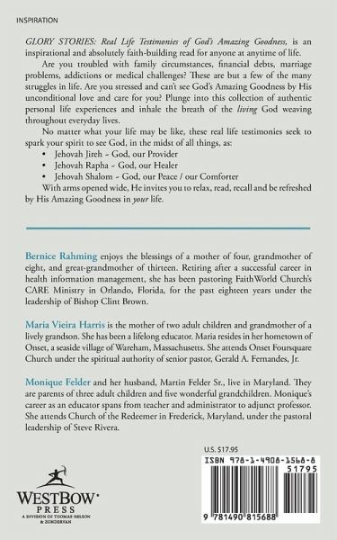 GLORY STORIES: Real Life Testimonies of God’s Amazing Goodness, is an inspirational and absolutely faith-building read for anyone at anytime of life. Are you troubled with family circumstances, financial debts, marriage problems, addictions or medical challenges? These are but a few of the many struggles in life. Are you stressed and can’t see God’s Amazing Goodness by His unconditional love and care for you? Plunge into this collection of authentic personal life experiences and inhale the breath of the living God weaving throughout everyday lives. No matter what your life may be like, these real life testimonies seek to spark your spirit to see God, in the midst of all things, as: Jehovah Jireh ~ God, our Provider Jehovah Rapha ~ God, our Healer Jehovah Shalom ~ God, our Peace / our Comforter With arms opened wide, He invites you to relax, read, recall and be refreshed by His Amazing Goodness in your life.
