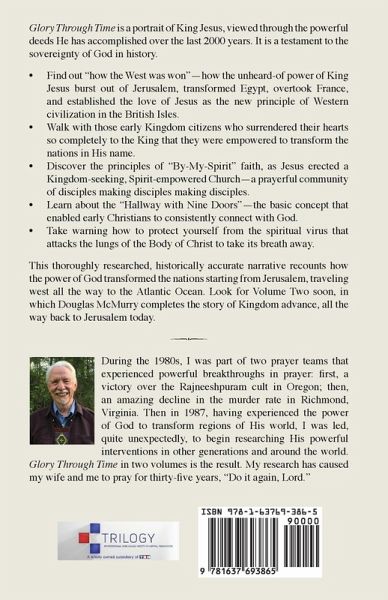 Glory Through Time is a portrait of King Jesus, viewed through the powerful deeds He has accomplished over the last 2000 years. It is a testament to the sovereignty of God in history. - Find out "how the West was won"-how the unheard-of power of King Jesus burst out of Jerusalem, transformed Egypt, overtook France, and established the love of Jesus as the new principle of Western civilization in the British Isles. - Walk with those early Kingdom citizens who surrendered their hearts so completely to the King that they were empowered to transform the nations in His name. - Discover the principles of "By-My-Spirit" faith, as Jesus erected a Kingdom-seeking, Spirit-empowered Church-a prayerful community of disciples making disciples making disciples. - Learn about the "Hallway with Nine Doors"-the basic concept that enabled early Christians to consistently connect with God. - Take warning how to protect yourself from the spiritual virus that attacks the lungs of the Body of Christ to take its breath away. This thoroughly researched, historically accurate narrative recounts how the power of God transformed the nations starting from Jerusalem, traveling west all the way to the Atlantic Ocean. Look for Volume Two soon, in which Douglas McMurry completes the story of Kingdom advance, all the way back to Jerusalem today.