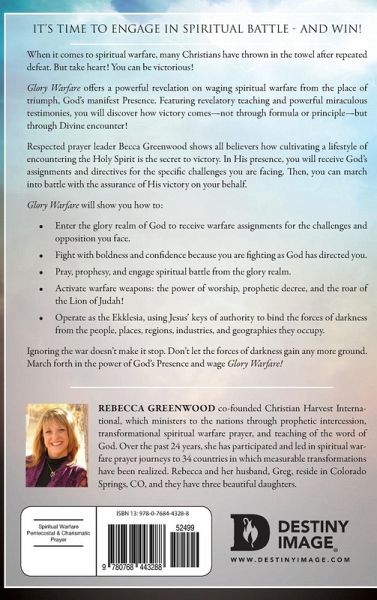 Glory Warfare: How the Presence of God Empowers you to Destroy the Works of Darkness Becca Greenwood It's time to engage in spiritual battle - and win! When it comes to spiritual warfare, many Christians have thrown in the towel after repeated defeat. But take heart! You can be victorious! Glory Warfare offers a powerful revelation on waging spiritual warfare from the place of triumph, God's manifest Presence. Featuring revelatory teaching and powerful miraculous testimonies, you will discover how victory comes-not through formula or principle-but through Divine encounter! Respected prayer leader, Becca Greenwood shows all believers how cultivating a lifestyle of encountering the Holy Spirit is the secret to victory. In His presence, you will receive God's assignments and directives for the specific challenges you are facing. Then, you can march into battle with the assurance of His victory on your behalf. Glory Warfare will show you how to: Enter the glory realm of God to receive warfare assignments for the challenges and opposition you face. Fight with boldness and confidence because you are fighting as God has directed you. Pray, prophesy, and engage spiritual battle from the glory realm. Activate warfare weapons: the power of worship, prophetic decree, and the roar of the Lion of Judah! Operate as the Ekklesia, using Jesus' keys of authority to bind the forces of darkness from the people, places, regions, industries and geographies they occupy. Ignoring the war doesn't make it stop. Don't let the forces of darkness gain any more ground.March forth in the power of God's Presence and wage Glory Warfare!