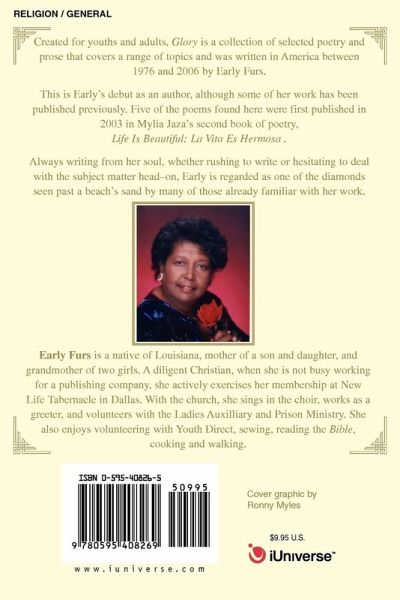 Created for youths and adults, Glory is a collection of selected poetry and prose that covers a range of topics and was written in America between 1976 and 2006 by Early Furs. This is Early's debut as an author, although some of her work has been published previously. Five of the poems found here were first published in 2003 in Mylia Jaza's second book of poetry, Life Is Beautiful: La Vita Es Hermosa. Always writing from her soul, whether rushing to write or hesitating to deal with the subject matter head-on, Early is regarded as one of the diamonds seen past a beach's sand by many of those already familiar with her work.
