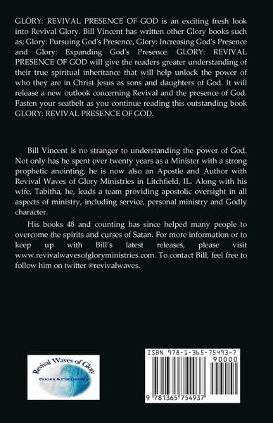 GLORY: REVIVAL PRESENCE OF GOD is an exciting fresh look into Revival Glory. Bill Vincent has written other Glory books such as; Glory: Pursuing God's Presence, Glory: Increasing God's Presence and Glory: Expanding God's Presence. GLORY: REVIVAL PRESENCE OF GOD will give the readers greater understanding of their true spiritual inheritance that will help unlock the power of who they are in Christ Jesus as sons and daughters of God. It will release a new outlook concerning Revival and the presence of God. Fasten your seatbelt as you continue reading this outstanding book GLORY: REVIVAL PRESENCE OF GOD.