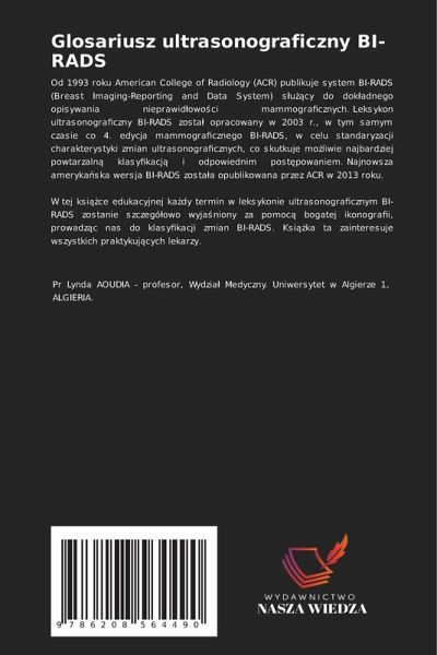 Od 1993 roku American College of Radiology (ACR) publikuje system BI-RADS (Breast Imaging-Reporting and Data System) s¿u¿¿cy do dok¿adnego opisywania nieprawid¿owo¿ci mammograficznych. Leksykon ultrasonograficzny BI-RADS zostä opracowany w 2003 r., w tym samym czasie co 4. edycja mammograficznego BI-RADS, w celu standaryzacji charakterystyki zmian ultrasonograficznych, co skutkuje mo¿liwie najbardziej powtarzaln¿ klasyfikacj¿ i odpowiednim post¿powaniem. Najnowsza amerykäska wersja BI-RADS zostäa opublikowana przez ACR w 2013 roku.W tej ksi¿¿ce edukacyjnej kädy termin w leksykonie ultrasonograficznym BI-RADS zostanie szczegó¿owo wyjäniony za pomoc¿ bogatej ikonografii, prowadz¿c nas do klasyfikacji zmian BI-RADS. Ksi¿¿ka ta zainteresuje wszystkich praktykuj¿cych lekarzy.