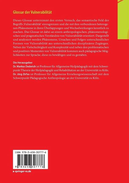 Dieses Glossar unternimmt den ersten Versuch, das semantische Feld des Begriffs 'Vulnerabilität' einzugrenzen und die mit ihm verbundenen heterogenen Phänomene in ihren Überlappungen und Wechselwirkungen kenntlich zu machen. Das Glossar ist dabei an einem anthropologischen, phänomenologischen und pragmatischen Verständnis von Vulnerabilität orientiert. Dargestellt und analysiert werden Phänomene, Ursachen und Folgen unterschiedlicher Formen von Vulnerabilität aus unterschiedlichen disziplinären Zugängen. Neben der Vielschichtigkeit und Komplexität und neben den problematischen und positiven Momenten von Vulnerabilität kommen auch pädagogische Möglichkeiten zur Sprache, diese zu bewältigen und zu gestalten.
