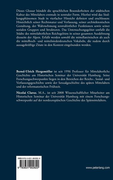 Dieses Glossar bündelt die sprachlichen Besonderheiten der städtischen Kultur des Mittelalters erstmals in zentraler Form. Hierbei wird das Siedlungsphänomen Stadt in vierfacher Hinsicht definiert und erschlossen: Hinsichtlich seiner Rechtsnatur und Verfassung, seiner architektonischen Gestaltung, der Wahrnehmung zentralörtlicher Funktionen sowie seiner sozialen Gruppen und Strukturen. Das Untersuchungsgebiet umfaßt die Städte des mittelalterlichen Reichsgebiets in seiner gesamten Ausdehnung diesseits der Alpen. Erfaßt werden sowohl die mittellateinischen als auch die mittelhoch- und mittelniederdeutschen Vokabeln, die zudem durch aussagekräftige Zitate in den Kontext eingebunden werden.