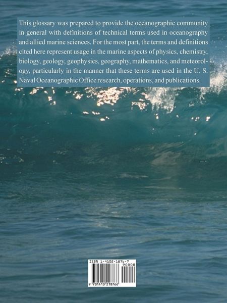 This glossary was prepared to provide the oceanographic community in general with definitions of technical terms used in oceanography and allied marine sciences. For the most part, the terms and definitions cited here represent usage in the marine aspects of physics, chemistry, biology, geology, geophysics, geography, mathematics, and meteorology, particularly in the manner that these terms are used in the U. S. Naval Oceanographic Office research, operations, and publications.