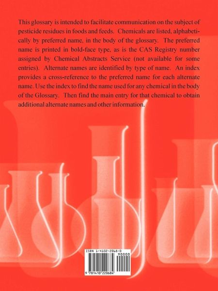 This glossary is intended to facilitate communication on the subject of pesticide residues in foods and feeds. Chemicals are listed, alphabetically by preferred name, in the body of the glossary. The preferred name is printed in bold-face type, as is the CAS Registry number assigned by Chemical Abstracts Service (not available for some entries). Alternate names are identified by type of name. An index provides a cross-reference to the preferred name for each alternate name. Use the index to find the name used for any chemical in the body of the Glossary. Then find the main entry for that chemical to obtain additional alternate names and other information.