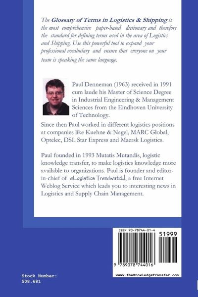 The Glossary of Terms in Logistics & Shipping is the most comprehensive paper-based dictionary and therefore the standard for defining terms used in the area of Logistics and Shipping. Use this powerful tool to expand your professional vocabulary and ensure that everyone on your team is speaking the same language. First edition, paperback, isbn 978-9-0787-4401-6 www.theKnowledgeTransfer.com