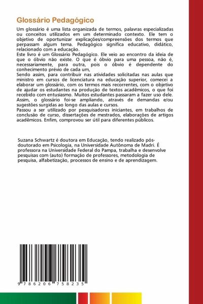 Um glossário é uma lista organizada de termos, palavras especializadas ou conceitos utilizados em um determinado contexto. Ele tem o objetivo de oportunizar explicações/compreensões dos termos que perpassam algum tema. Pedagógico significa educativo, didático, relacionado com a educação.Este livro é um Glossário Pedagógico. Ele veio ao encontro da ideia de que o óbvio não existe. O que é óbvio para uma pessoa, não é, necessariamente, para outra, pois o óbvio é dependente do conhecimento prévio de cada um, Sendo assim, para contribuir nas atividades solicitadas nas aulas que ministro em cursos de licenciatura na educação superior, comecei a elaborar um glossário, com os termos mais recorrentes, com o objetivo de ajudar os estudantes na produção de textos acadêmicos, o que foi recebido com entusiasmo. Muitos estudantes passaram a fazer uso dele. Assim, o glossário foi-se ampliando, através de demandas e/ou sugestões surgidas ao longo das aulas e cursos. Passou a ser utilizado por pesquisadores iniciantes, em trabalhos de conclusão de curso, dissertações de mestrados, elaborações de artigos acadêmicos. Enfim, comprovou ser útil para diferentes públicos.