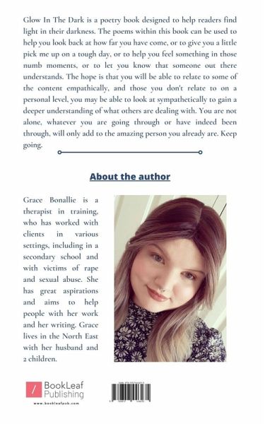 Glow In The Dark is a poetry book designed to help readers find light in their darkness. The poems within this book can be used to help you look back at how far you have come, or to give you a little pick me up on a tough day, or to help you feel something in those numb moments, or to let you know that someone out there understands. The hope is that you will be able to relate to some of the content empathically, and those you don't relate to on a personal level, you may be able to look at sympathetically to gain a deeper understanding of what others are dealing with. You are not alone, whatever you are going through or have indeed been through, will only add to the amazing person you already are. Keep going.