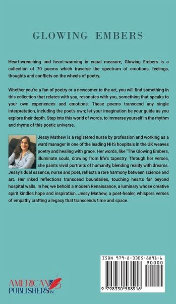 Delve into the depths of human emotion with "Glowing Embers," a poignant collection of 70 poems that explore the spectrum of feelings, thoughts, and conflicts that shape our lives. A Tapestry of Emotions: Jessy Mathew, a registered nurse and gifted poet, masterfully weaves words into a tapestry of human experiences. Her verses, like glowing embers, illuminate the soul, drawing from the rich tapestry of life. A Symphony of Words: Whether you're a seasoned poetry enthusiast or new to the art form, "Glowing Embers" offers something for everyone. The poems transcend individual interpretations, inviting you to immerse yourself in their rhythm and rhyme, and explore their depths with your own imagination as your guide. A Poetic Healer: Jessy Mathew's unique blend of medical expertise and poetic talent creates a rare harmony between science and art. Her words transcend boundaries, touching hearts far beyond hospital walls. Step into the world of "Glowing Embers" and let its verses ignite your imagination and inspire your soul.