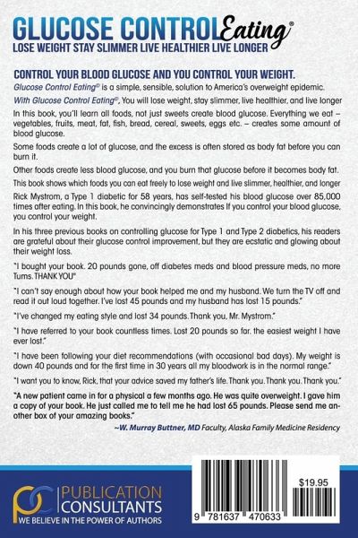 Glucose Control Eating(c) is a simple, sensible, solution to America's overweight epidemic. With Glucose Control Eating(c), You will lose weight, stay slimmer, live healthier, and live longer. In this book, you'll learn all foods, not just sweets create blood glucose. Everything we eat-vegetables, fruits, meat, fat, fish, bread, cereal, sweets, eggs etc.-creates some amount of blood glucose. Some foods create a lot of blood glucose and are stored as body fat before you can burn that glucose. Other foods create less blood glucose, and you burn that glucose before it becomes body fat. This book shows which foods you can eat freely to lose weight and live slimmer, healthier, and longer Rick Mystrom, a Type 1 diabetic for 58 years, has self-tested his blood glucose over 85,000 times after eating. In this book, he convincingly demonstrates If you control your blood glucose, you control your weight. In his three previous books on controlling glucose for Type 1 and Type 2 diabetics, his readers are grateful about their glucose control improvement, but they are ecstatic and glowing about their weight loss. "I bought your book. 20 pounds gone, off diabetes meds and blood pressure meds, no more Tums. THANK YOU" "I can't say enough about how your book helped me and my husband. We turn the TV off and read it out loud together. I've lost 45 pounds and my husband has lost 15 pounds." "I've changed my eating style and lost 34 pounds. Thank you, Mr. Mystrom." "I have referred to your book countless times. Lost 20 pounds so far. the easiest weight I have ever lost." "I have been following your diet recommendations (with occasional bad days). My weight is down 40 pounds and for the first time in 30 years all my bloodwork is in the normal range." "A new patient came in for a physical a few months ago. He was quite overweight. I gave him a copy of your book. He just called me to tell me he had lost 65 pounds. Please send me another box of your amazing books." "I want you to know, Rick, that your advice saved my father's life. Thank you. Thank you. Thank you."