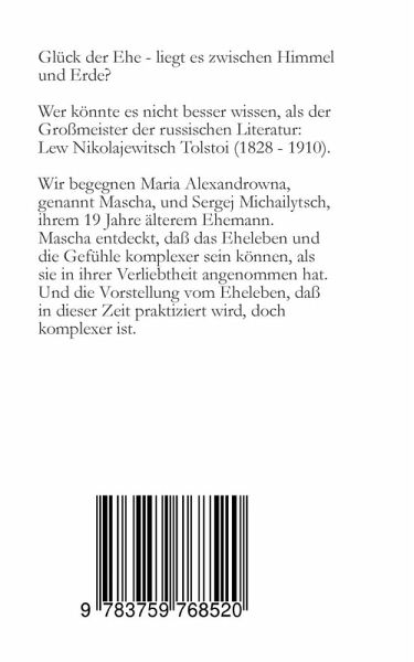 Glück der Ehe - liegt es zwischen Himmel und Erde? Wer könnte es besser wissen, als der Großmeister der russischen Literatur: Lew Nikolajewitsch Tolstoi (1828 - 1910). Wir begegnen Maria Alexandrowna, genannt Mascha, und Sergej Michailytsch, ihrem 19 Jahre älteren Ehemann. Mascha entdeckt, dass das Eheleben und die Gefühle komplexer sein können, als sie in ihrer Verliebtheit angenommen hat. Und die Vorstellung vom Eheleben, das in dieser Zeit praktiziert wird, doch vielschichtiger ist.