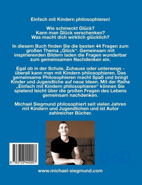 Einfach mit Kindern philosophieren!Wie schmeckt Glück?Kann man Glück verschenken?Was macht dich wirklich glücklich?In diesem Buch finden Sie die besten 44 Fragen zum großen Thema "Glück". Gemeinsam mit inspirierenden Bildern laden die Fragen wunderbar zum gemeinsamen Nachdenken ein.Egal ob in der Schule, Zuhause oder unterwegs - überall kann man mit Kindern philosophieren. Das gemeinsame Philosophieren macht Spaß und bringt Kinder und Jugendliche auf neue Ideen. Mit der Reihe "Einfach mit Kindern philosophieren" können Sie spielend leicht über die großen Fragen des Lebens gemeinsam nachdenken.