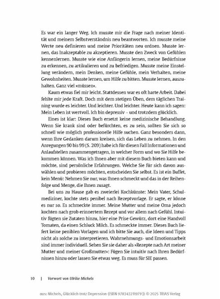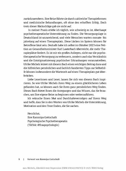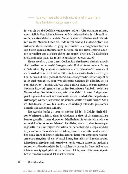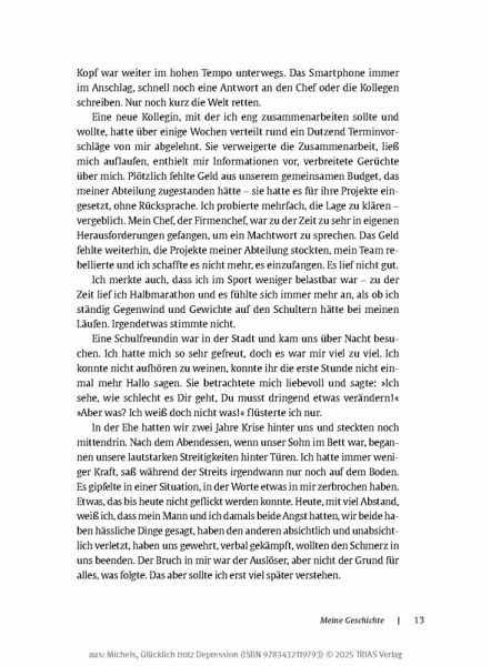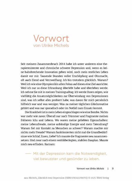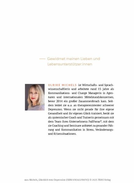 Wer eine depressive Phase durchlebt, weiß, wie schwer es ist, sich zurückzukämpfen und neuen Lebensmut zu spüren. Ulrike Michels ist selbst betroffen, hat viele Therapieansätze ausprobiert und weiß, wovon sie spricht. Sie hat sich ihr persönliches Glück in täglichem Training zurück erarbeitet.