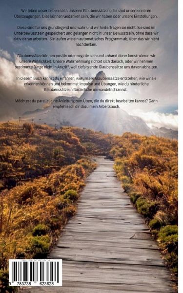 Wir leben unser Leben nach unseren Glaubenssätzen, das sind unsere inneren Überzeugungen. Dies können Gedanken sein, die wir haben oder unsere Einstellungen. Diese sind für uns grundlegend und wahr und wir hinterfragen sie nicht. Sie sind im Unterbewusstsein gespeichert und gelangen nicht in unser Bewusstsein, ohne dass wir aktiv daran arbeiten. Sie laufen wie ein automatisches Programm ab, über das wir nicht nachdenken.Glaubenssätze können positiv oder negativ sein und anhand ihrer konstruieren wir unsere Wirklichkeit. Unsere Wahrnehmung richtet sich danach, oder wir nehmen bestimmte Dinge nicht in Angriff, weil tiefsitzende Glaubenssätze uns davon abhalten.In diesem Buch kannst du erfahren, wie unsere Glaubenssätze entstehen, wie wir sie erkennen können und bekommst Impulse und Übungen, wie du hinderliche Glaubenssätze in förderliche umwandelnd kannst. Möchtest du eine Anleitung zum Üben, die du direkt bearbeiten kannst, empfehle ich dir mein Arbeitsbuch.