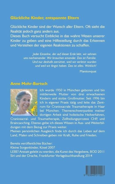 Anne Mohr-Bartsch wurde 1950 geboren, ist Mutter von drei erwachsenen Kindern und stolze Großmutter. Seit 1996 in eigener Praxis tätig und Leitung eines therapeutischen Teams (Zentrum für Craniosacrale Traumatherapie). Sie leitet Seminare und Ausbildungen in Craniosacral- und Traumatherapie. Malen und Schreiben sind der meditative Ausgleich. Bereits veröffentlichte Bücher: Kleine Sorgenkinder, Kösel 2007 LEBE! Anstatt gelebt zu werden, die Kunst des Vergebens, BOD 2011 Siri und der Drache, Frankfurter Verlagsbuchhandlung 2014