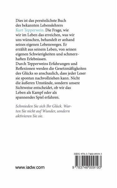 Dies ist das persönlichste Buch des bekannten Lebenslehrers Kurt Tepperwein. Die Frage, wie wir im Leben das erreichen, was wir uns wünschen, behandelt er anhand seines eigenen Lebensweges. Er erzählt aus seinem Leben, von seinen eigenen Schwierigkeiten und schmerzhaften Erlebnissen. Durch Tepperweins Erfahrungen und Reflexionen werden die Gesetzmäßigkeiten des Glücks so anschaulich, dass jeder Leser sie spontan nachvollziehen kann. Nicht die äußeren Umstände, sondern unsere Sichtweise entscheidet, ob wir das Leben als Kampf oder als spannendes Spiel erfahren.
