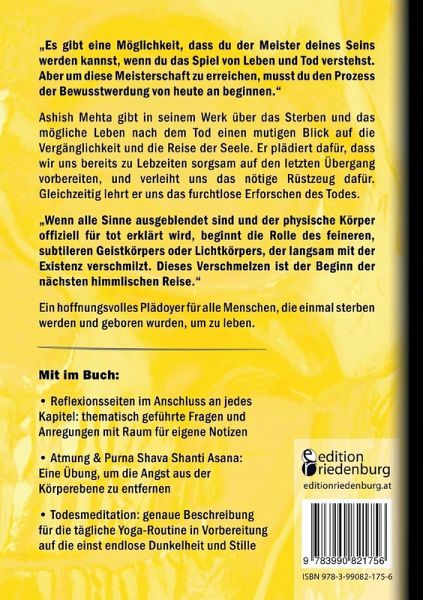 "Es gibt eine Möglichkeit, dass du der Meister deines Seins werden kannst, wenn du das Spiel von Leben und Tod verstehst. Aber um diese Meisterschaft zu erreichen, musst du den Prozess der Bewusstwerdung von heute an beginnen." Ashish Mehta gibt in seinem Werk über das Sterben und das mögliche Leben nach dem Tod einen mutigen Blick auf die Vergänglichkeit und die Reise der Seele. Er plädiert dafür, dass wir uns bereits zu Lebzeiten sorgsam auf den letzten Übergang vorbereiten, und verleiht uns das nötige Rüstzeug dafür. Gleichzeitig lehrt er uns das furchtlose Erforschen des Todes. "Wenn alle Sinne ausgeblendet sind und der physische Körper offiziell für tot erklärt wird, beginnt die Rolle des feineren, subtileren Geistkörpers oder Lichtkörpers, der langsam mit der Existenz verschmilzt. Dieses Verschmelzen ist der Beginn der nächsten himmlischen Reise." Ein hoffnungsvolles Plädoyer für alle Menschen, die einmal sterben werden und geboren wurden, um zu leben. Mit im Buch: * Reflexionsseiten im Anschluss an jedes Kapitel: thematisch geführte Fragen und Anregungen mit Raum für eigene Notizen * Atmung & Purna Shava Shanti Asana: Eine Übung, um die Angst aus der Körperebene zu entfernen * Todesmeditation: genaue Beschreibung für die tägliche Yoga-Routine in Vorbereitung auf die einst endlose Dunkelheit und Stille