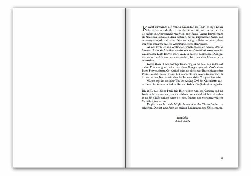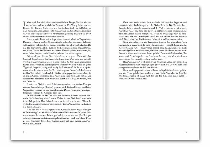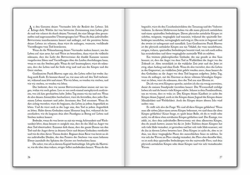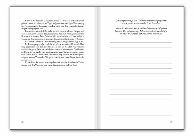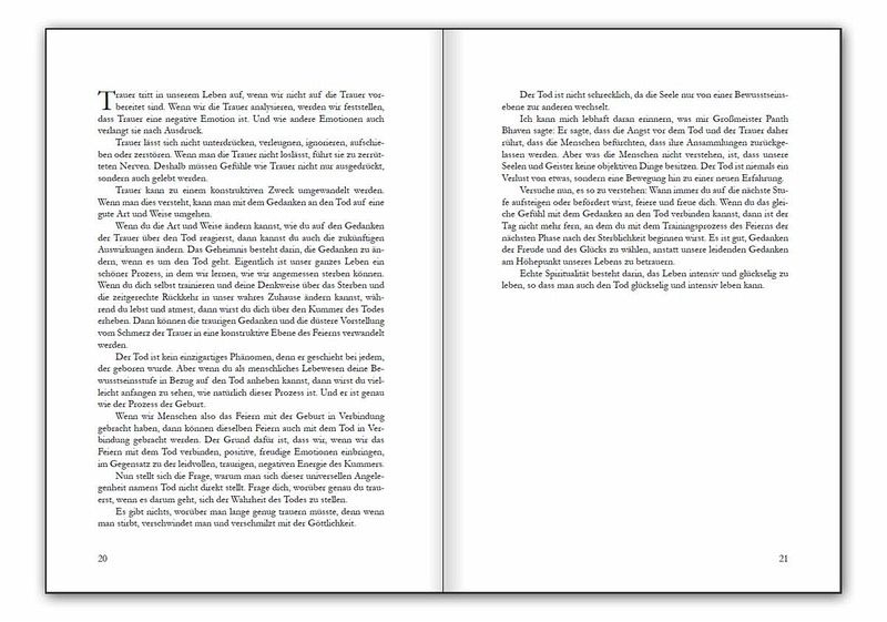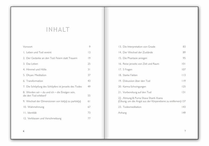 Vorwort ... 9 1. Leben und Tod vereint ... 13 2. Der Gedanke an den Tod: Feiern statt Trauern ... 19 3. Das Leben ... 25 4. Himmel und Hölle ... 31 5. Dhyan: Meditation ... 37 6. Transformation ... 43 7. Die Schöpfung des Schöpfers ist jenseits des Todes ... 49 8. Werden wir - du und ich - die Einzigen sein, die den Tod erleben? ... 55 9. Wechsel der Dimensionen von lok(a) zu parlok(a) ... 61 10. Wahrnehmung ... 67 11. Identität ... 73 12. Verblassen und Verschmelzung ... 77 13. Die Interpretation von Gnade ... 83 14. Der Wechsel der Zustände ... 89 15. Die Phantasie anregen ... 95 16. Reise jenseits von Zeit und Raum ... 101 17. 5 Fragen ... 107 18. Starke Fakten ... 113 19. Diskussion über den Tod ... 119 20. Karma-Schwingungen ... 125 21. Vorbereitung auf den Tod ... 131 22. Atmung & Purna Shava Shanti Asana (Übung, um die Angst aus der Körperebene zu entfernen) ... 137 23. Todesmeditation ... 143 Anhang ... 149