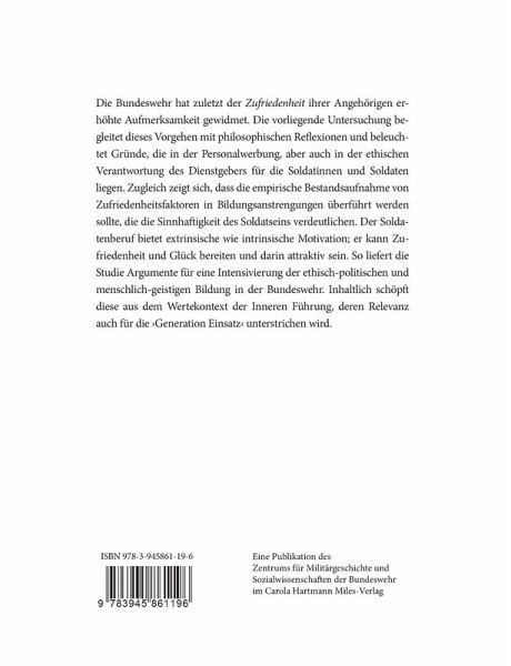 Die Bundeswehr hat zuletzt der Zufriedenheit ihrer Angehörigen erhöhte Aufmerksamkeit gewidmet. Die vorliegende Untersuchung begleitet dieses Vorgehen mit philosophischen Reflexionen und beleuchtet Gründe, die in der Personalwerbung, aber auch in der ethischen Verantwortung des Dienstgebers für die Soldatinnen und Soldaten liegen. Zugleich zeigt sich, dass die empirische Bestandsaufnahme von Zufriedenheitsfaktoren in Bildungsanstrengungen überführt werden sollte, die die Sinnhaftigkeit des Soldatseins verdeutlichen. Der Soldatenberuf bietet extrinsische wie intrinsische Motivation; er kann Zufriedenheit und Glück bereiten und darin attraktiv sein. So liefert die Studie Argumente für eine Intensivierung der ethisch-politischen und menschlich-geistigen Bildung in der Bundeswehr. Inhaltlich schöpft diese aus dem Wertekontext der Inneren Führung, deren Relevanz auch für die ¿Generation Einsatz¿ unterstrichen wird.