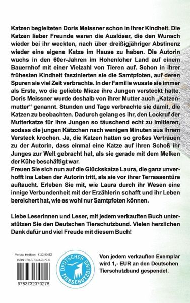 Freuen Sie sich nun auf die Glückskatze Laura, die ganz unverhofft ins Leben der Autorin tritt, als sie vor ihrer Terrassentüre auftaucht. Erleben Sie mit, wie Laura durch ihr Wesen eine innige Verbundenheit mit der Erzählerin schafft und ihr Leben bereichert hat, wie es wohl nur Samtpfoten können. - Liebe Leserinnen und Leser, mit jedem verkauften Buch unterstützen Sie den Deutschen Tierschutzbund mit einem Betrag von 1,- Euro. Vielen herzlichen Dank dafür.