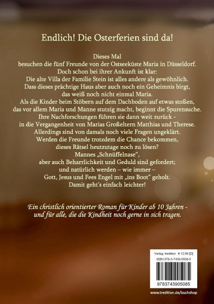 In diesem Buch finden sich die Freunde in den Osterferien bei Maria in der Düsseldorfer Villa ein. Doch der 13 -jährige Manne fühlt sich in dem Protzbau nicht wohl. Außerdem kann er seinem "Hühnerhaufen" nicht aus dem Weg gehen. Die Situation ändert sich schlagartig, als er auf dem Dachboden Hinweise aufstöbert, die in die Zeit des Krieges zurückführen. Durch ein aufklärendes Gespräch mit Marias Eltern werden viele Unklarheiten zwar beseitigt, dennoch bleibt die größte Frage offen: Haben sie die Chance die alte Dame, die als Kind dort oben versteckt wurde, zu finden? Nun hat Manne eine Aufgabe, die ihn sehr fesselt und gemeinsam mit seinen "Mädels" macht er sich auf Spurensuche. Unterstützung bekommen sie von Marias muslimischer Schulfreundin Dilara. Eingebettet in eine Woche, in der auch Kreuzigung und Auferstehung ein Thema ist, erleben sie eine extrem spannungsreiche Zeit.