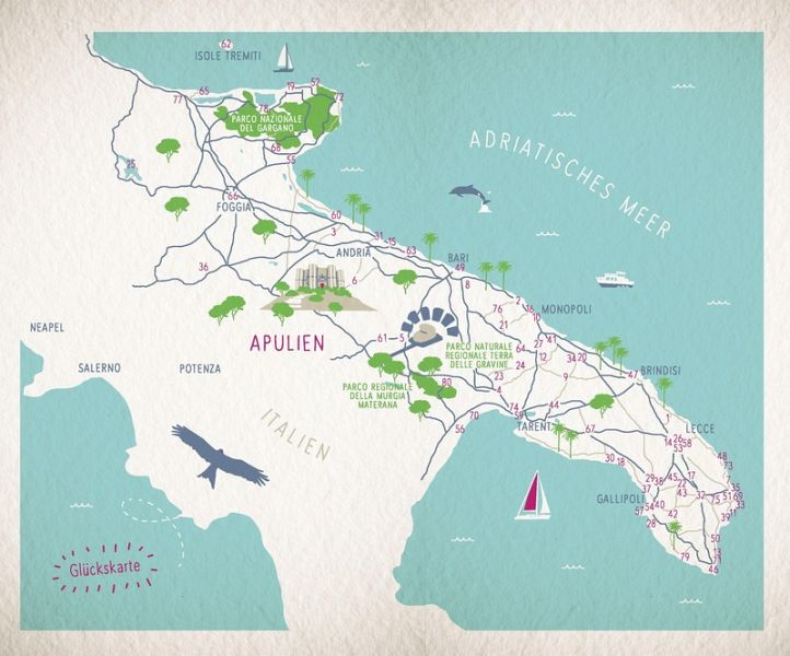 Traumhafte Strände, magische Grotten und der größte Canyon Europas: Italiens Stiefelabsatz ist ein wahres Naturparadies. Umarmt von zwei Meeren zeigt Apulien auch seine historische und kreative Seite: Antike Stätten und traditionelles Kunsthandwerk locken zu spannenden Auszeiten. Feinstes Olivenöl, erfrischendes Fenchel-Eis und selbst gemachte Orangenmarmelade zaubern köstliche Genussmomente. Ein Landstrich, der mit seinem liebevollen Charme Herz und Sinne berührt.