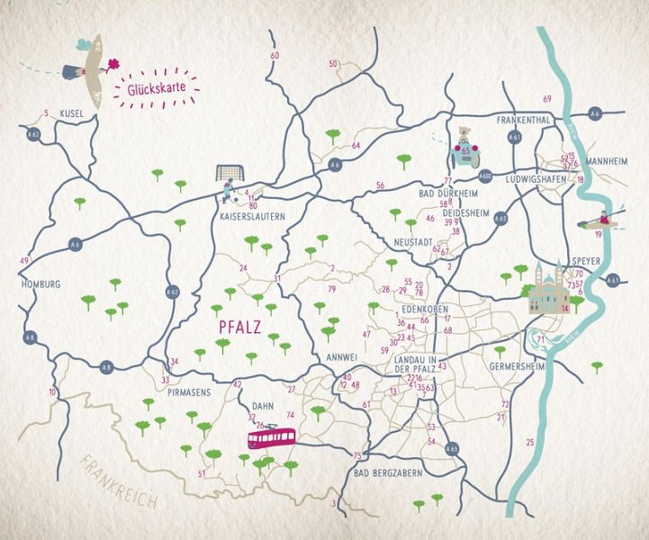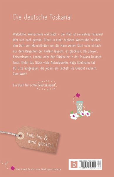 Walddüfte, Weinschorle und Glück - die Pfalz ist ein wahres Paradies! Wer sich nach getaner Arbeit in einer schönen Weinstube belohnt, den Duft von Mandelblüten um die Nase wehen lässt oder einfach nur dem Rauschen der Kiefern lauscht, ist glücklich. Ob Speyer, Kaiserslautern, Landau oder Bad Dürkheim: in der Toskana Deutschlands findet das Glück viele Anlaufpunkte. Katja Edelmann hat 80 Orte aufgespürt, die jedem ein Lächeln ins Gesicht zaubern. Zum Wohl!