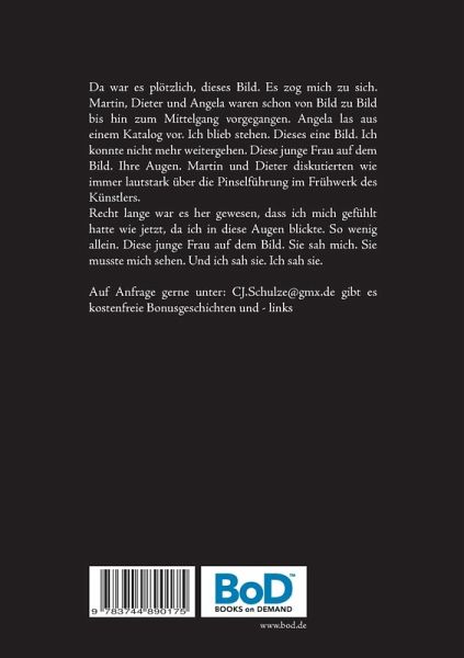 Da war es plötzlich, dieses Bild. Es zog mich zu sich. Martin, Dieter und Angela waren schon von Bild zu Bild bis hin zum Mittelgang vorgegangen. Angela las aus einem Katalog vor. Ich blieb stehen. Dieses eine Bild. Ich konnte nicht mehr weitergehen. Diese junge Frau auf dem Bild. Ihre Augen. Martin und Dieter diskutierten lautstark über die Pinselführung im Frühwerk des Künstlers. Recht lange war es her gewesen, dass ich mich gefühlt hatte wie jetzt, da ich in diese Augen blickte. So wenig allein. Diese junge Frau auf dem Bild. Sie sah mich. Sie musste mich sehen. Und ich sah sie. Ich sah sie.Auf Anfrage unter: CJ.Schulze@gmx.de gibt es kostenfreie Bonusgeschichten und - linksÄhnlichkeiten mit noch lebenden, bereits verstorbenen, oder zum Zeitpunkt der Herausgabe dieser Geschichten noch nicht geborenen Personen sind (wie in allen guten Geschichten) rein zufällig.Autorin: Claudia J. Schulze, Konstanz, Offenburg & Strasbourg