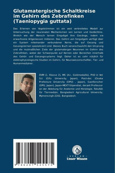 Das Erlernen von Vogelstimmen ist ein weit verbreitetes Modell zur Untersuchung der neuronalen Mechanismen von Lernen und Gedächtnis. Ähnlich wie der Mensch lernen Singvögel ihre Gesänge, indem sie erwachsene Artgenossen imitieren. Das Gehirn von Singvögeln verfügt über ein System miteinander verbundener Kerne, die auf Gesang und Gesangslernen spezialisiert sind. Dieses Buch veranschaulicht den Ursprung und die mutmaßlichen Ziele der glutamatergen Neuronen im Gehirn des Zebrafinken, wobei der Schwerpunkt auf Kernen oder Bereichen innerhalb des Gehör- und Gesangssystems liegt. Daher ist es sehr nützlich für elektrophysiologische Studien im Gehirn, für Neurowissenschaftler, Tier- und Humanmediziner.