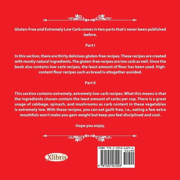 Gluten-Free and Extremely Low Carb comes in two parts that's never been published before. Part I In this section, there are thirty delicious gluten-free recipes. These recipes are created with mostly natural ingredients. The gluten-free recipes are low carb as well. Since the book also contains low-carb recipes, the least amount of flour has been used. High-content flour recipes such as bread is altogether avoided. Part II This section contains extremely, extremely low-carb recipes .What this means is that the ingredients chosen contain the least amount of carbs per cup. There is a great usage of cabbage, spinach, and mushrooms as carb content in these vegetables is extremely low. With these recipes, you can eat guilt-free, i.e., eating a few extra mouthfuls won't make you gain weight but keep you feel disciplined and cool. Hope you enjoy.