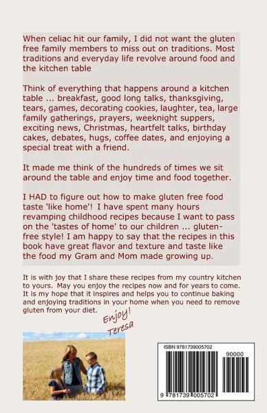 Enjoy this COLORFUL 150 page GLUTEN FREE cookbook full of family favourites. EACH recipe has a PHOTO and a couple of recipes have PHOTO step by step instructions, to help you be successful. If you have intolerances to dairy and egg, many of the recipes are also dairy and egg free. In the back of the book there is a section that sorts the recipes into gluten, dairy and egg free to help you navigate recipes based on intolerances, if needed. Also, on the top of each recipe it clearly marks if the recipe is just Gluten Free or also Dairy and/or Egg Free. ____________________________________________________________________________________________ When celiac hit our family, I did not want the gluten free family members to miss out on traditions. Most traditions and everyday life revolves around food and the kitchen table. Think of everything that happens around a kitchen table ... breakfast, good long talks, thanksgiving, tears, games, decorating cookies, laughter, tea, large family gatherings, prayers, weeknight suppers, exciting news, Christmas, heart felt talks, birthday cakes, debates, hugs, coffee dates, and enjoying a special treat with a friend. It made me think of the hundreds of times we sit around the table and enjoy time and food together. I HAD to figure out how to make gluten free food taste 'like home'! I have spent many hours revamping childhood recipes because I want to pass on the 'tastes of home' to our children ... gluten-free style! I am happy to say that the recipes in this book have great flavor and texture and taste like the food my Gram and mom made growing up. It is with joy that I share these recipes from my country kitchen to yours. May you enjoy the recipes now and for years to come. It is my hope that it inspires and helps you to continue baking and enjoying traditions in your home, when you need to remove gluten from your diet. Enjoy, Teresa