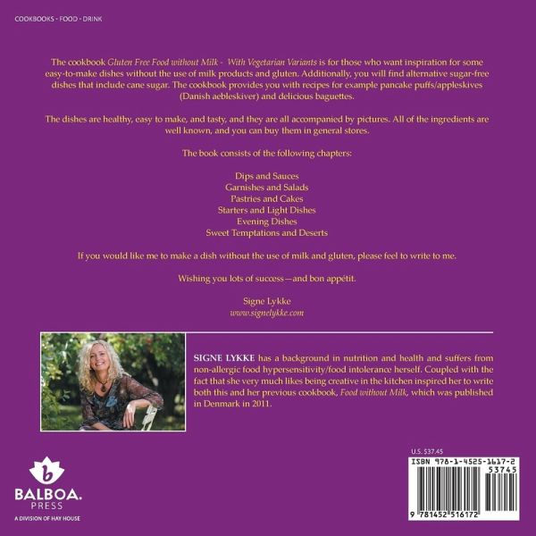 The cookbook Gluten Free Food without Milk - With Vegetarian Variants is for those who want inspiration for some easy-to-make dishes without the use of milk products and gluten. Additionally, you will find alternative sugar-free dishes that include cane sugar. The cookbook provides you with recipes for example pancake puffs/appleskives (Danish aebleskiver) and delicious baguettes. The dishes are healthy, easy to make, and tasty, and they are all accompanied by pictures. All of the ingredients are well known, and you can buy them in general stores. The book consists of the following chapters: Dips and Sauces Garnishes and Salads Pastries and Cakes Starters and Light Dishes Evening Dishes Sweet Temptations and Deserts If you would like me to make a dish without the use of milk and gluten, please feel to write to me. Wishing you lots of success-and bon appétit. Signe Lykke www.signelykke.com