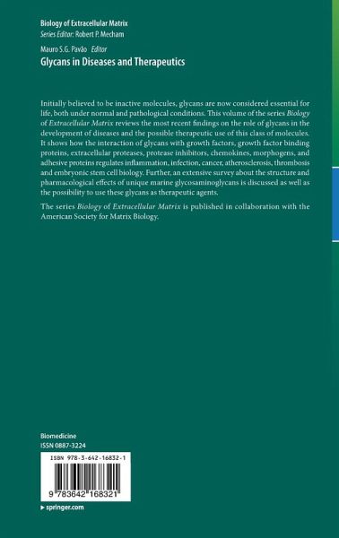 This volume of the series "Biology of Extracellular Matrix" reviews the most recent findings on the role of glycans in the development of diseases and the possible therapeutic use of this class of molecules. It shows how the interaction of glycans with growth factors, growth factor binding proteins, extracellular proteases, protease inhibitors, chemokines, morphogens, and adhesive proteins regulates inflammation, infection, cancer, atherosclerosis, thrombosis and embryonic stem cell biology. Furthermore, an extensive survey about the structure and pharmacological effects of unique marine glycosaminoglycans is discussed as well as the possibility of using these glycans as therapeutic agents.