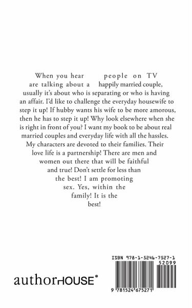 When you hear people on TV are talking about a happily married couple, usually it's about who is separating or who is having an affair. I'd like to challenge the everyday housewife to step it up! If hubby wants his wife to be more amorous, then he has to step it up! Why look elsewhere when she is right in front of you? I want my book to be about real married couples and everyday life with all the hassles. My characters are devoted to their families. Their love life is a partnership! There are men and women out there that will be faithful and true! Don't settle for less than the best! I am promoting sex. Yes, within the family! It is the best!