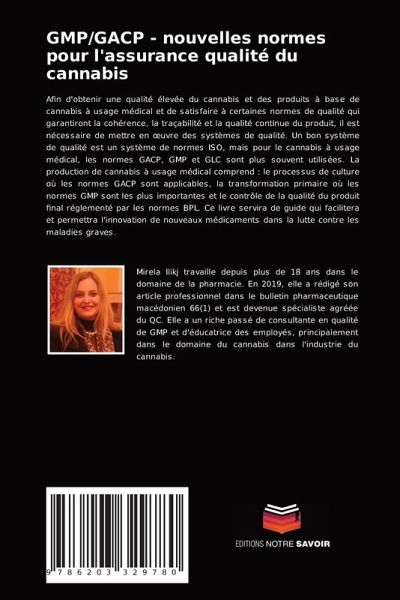 Afin d'obtenir une qualité élevée du cannabis et des produits à base de cannabis à usage médical et de satisfaire à certaines normes de qualité qui garantiront la cohérence, la traçabilité et la qualité continue du produit, il est nécessaire de mettre en oeuvre des systèmes de qualité. Un bon système de qualité est un système de normes ISO, mais pour le cannabis à usage médical, les normes GACP, GMP et GLC sont plus souvent utilisées. La production de cannabis à usage médical comprend : le processus de culture où les normes GACP sont applicables, la transformation primaire où les normes GMP sont les plus importantes et le contrôle de la qualité du produit final réglementé par les normes BPL. Ce livre servira de guide qui facilitera et permettra l'innovation de nouveaux médicaments dans la lutte contre les maladies graves.