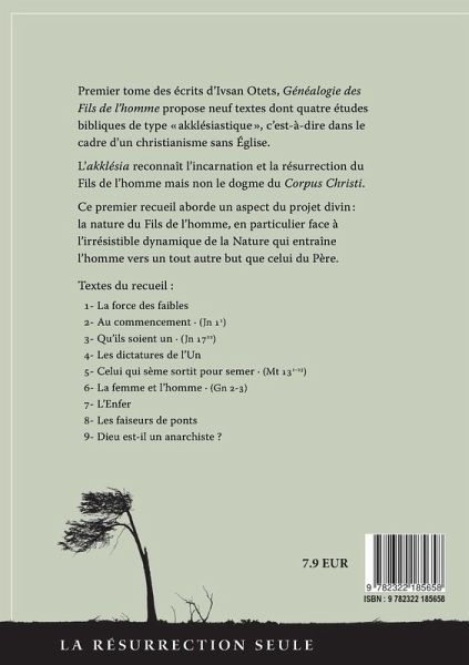 Premier tome des écrits d'Ivsan Otets, "Généalogie des Fils de l'homme" propose neuf textes dont quatre études bibliques de type "akklésiastique", c'est-à-dire dans le cadre d'un christianisme sans Église.L'akklésia reconnaît l'incarnation et la résurrection du Fils de l'homme mais non le dogme du Corpus Christi.Ce premier recueil aborde un aspect du projet divin : la nature du Fils de l'homme, en particulier face à l'irrésistible dynamique de la Nature/Raison, ces dernières ayant pour l'homme un tout autre but que celui du Père.Le projet divin pour l'homme est annoncé par le Ressuscité.Textes du recueil :1- La force des faibles2- Au commencement3- Qu'ils soient un4- Les dictatures de l'Un5- Celui qui sème sortit pour semer6- La femme et l'homme7- L'Enfer8- Les faiseurs de ponts9- Dieu est-il un anarchiste ?