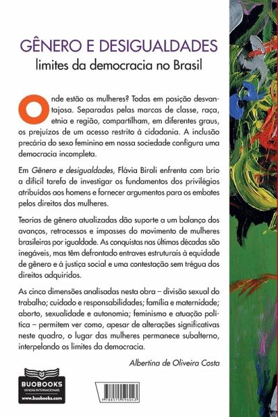 "Em Gênero e desigualdades, a cientista política Flávia Biroli, professora do Instituto de Ciência Política da Universidade de Brasília, apresenta as muitas transformações nas relações de gênero ocorridas nas décadas recentes. Os grandes temas do feminismo pós-1970 aparecem, em cada capítulo, com os diversos cenários históricos mundiais e nacionais que os moldaram, frearam ou impulsionaram as lutas das mulheres. Situada no contexto brasileiro, a obra ilumina as discussões sobre desigualdade entre homens e mulheres com o objetivo de compreender os impasses que se apresentam na construção de relações de gênero mais justas. Para responder a esse desafio, a autora examina temas fundamentais dos direitos das mulheres, do feminismo e da democracia brasileira. Com linguagem refinada, precisa e clara, a pesquisadora analisa diferentes dimensões - divisão sexual do trabalho; cuidado e responsabilidades; família e maternidade; aborto, sexualidade e autonomia; feminismos e atuação política - que permitem ver como, apesar de alterações significativas, o lugar das mulheres permanece subalterno, interpelando os limites da democracia. A partir do diálogo sistemático com o debate teórico internacional contemporâneo e incorporando elementos empíricos e contextuais, Flávia Biroli encerra o livro com uma análise de fôlego sobre a investida reacionária à agenda de gênero na América Latina. A orelha é de Céli Pinto e a quarta capa, de Albertina de Oliveira Costa."