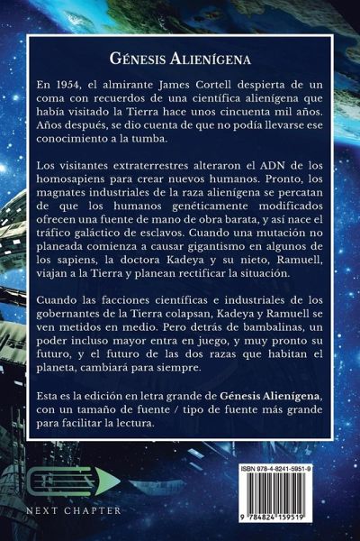 En 1954, el almirante James Cortell despierta de un coma con recuerdos de una científica alienígena que había visitado la Tierra hace unos cincuenta mil años. Años después, se dio cuenta de que no podía llevarse ese conocimiento a la tumba. Los visitantes extraterrestres alteraron el ADN de los homosapiens para crear nuevos humanos. Pronto, los magnates industriales de la raza alienígena se percatan de que los humanos genéticamente modificados ofrecen una fuente de mano de obra barata, y así nace el tráfico galáctico de esclavos. Cuando una mutación no planeada comienza a causar gigantismo en algunos de los sapiens, la doctora Kadeya y su nieto, Ramuell, viajan a la Tierra y planean rectificar la situación. Cuando las facciones científicas e industriales de los gobernantes de la Tierra colapsan, Kadeya y Ramuell se ven metidos en medio. Pero detrás de bambalinas, un poder incluso mayor entra en juego, y muy pronto su futuro, y el futuro de las dos razas que habitan el planeta, cambiará para siempre. Esta es la edición en letra grande de Génesis Alienígena, con un tamaño de fuente / tipo de fuente más grande para facilitar la lectura.