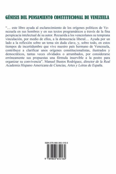 "… este libro ayuda al esclarecimiento de los orígenes políticos de Venezuela en sus hombres y en sus textos programáticos a través de la fina perspicacia intelectual de su autor. Recuerda a los venezolanos su temprana vinculación, por medio de ellos, a la democracia liberal… Ayuda por un lado a la reflexión sobre un tema sin duda clave, y, sobre todo, en estos tiempos de incertidumbre que vive nuestro país hermano de Venezuela, contribuye a clarificar unos orígenes constitucionalistas, ilustrados y democráticos, tantas veces olvidados o arrumbados, por considerarse erróneamente sus propuestas una fórmula inservible a la postre para organizar su convivencia". Manuel Bustos Rodríguez, director de la Real Academia Hispano Americana de Ciencias, Artes y Letras de España.
